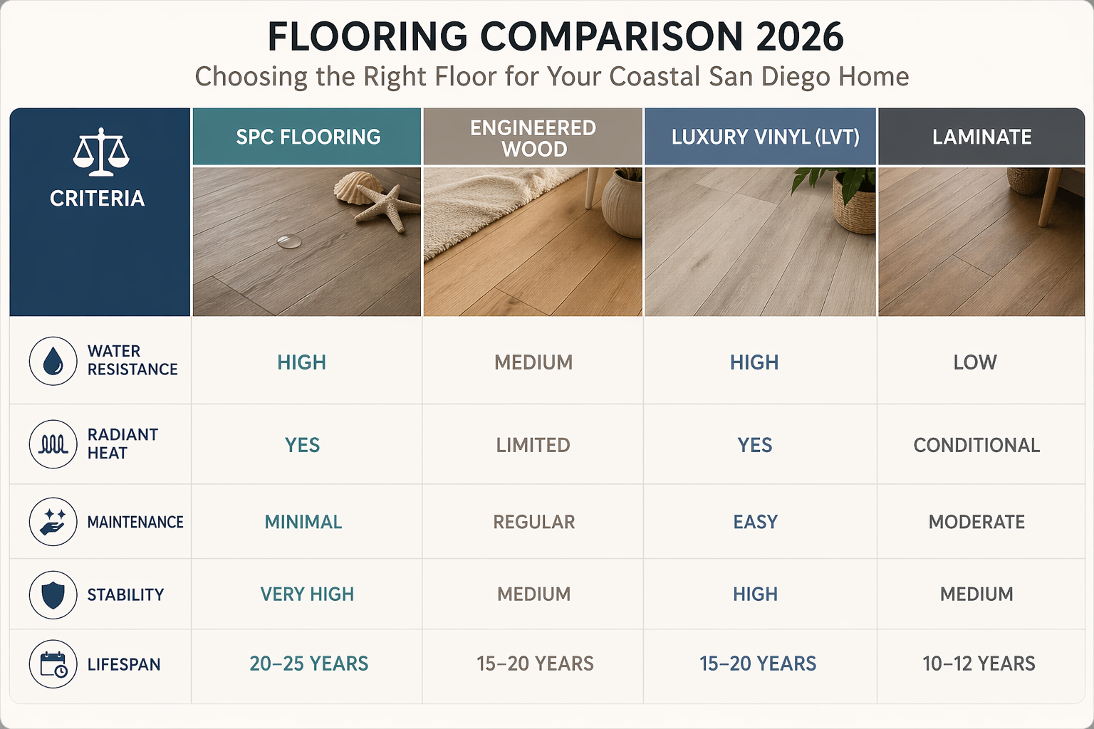In San Diegoβs climate, where humidity fluctuates but stays moderate, engineered wood flooring performs especially well, maintaining stability without warping.